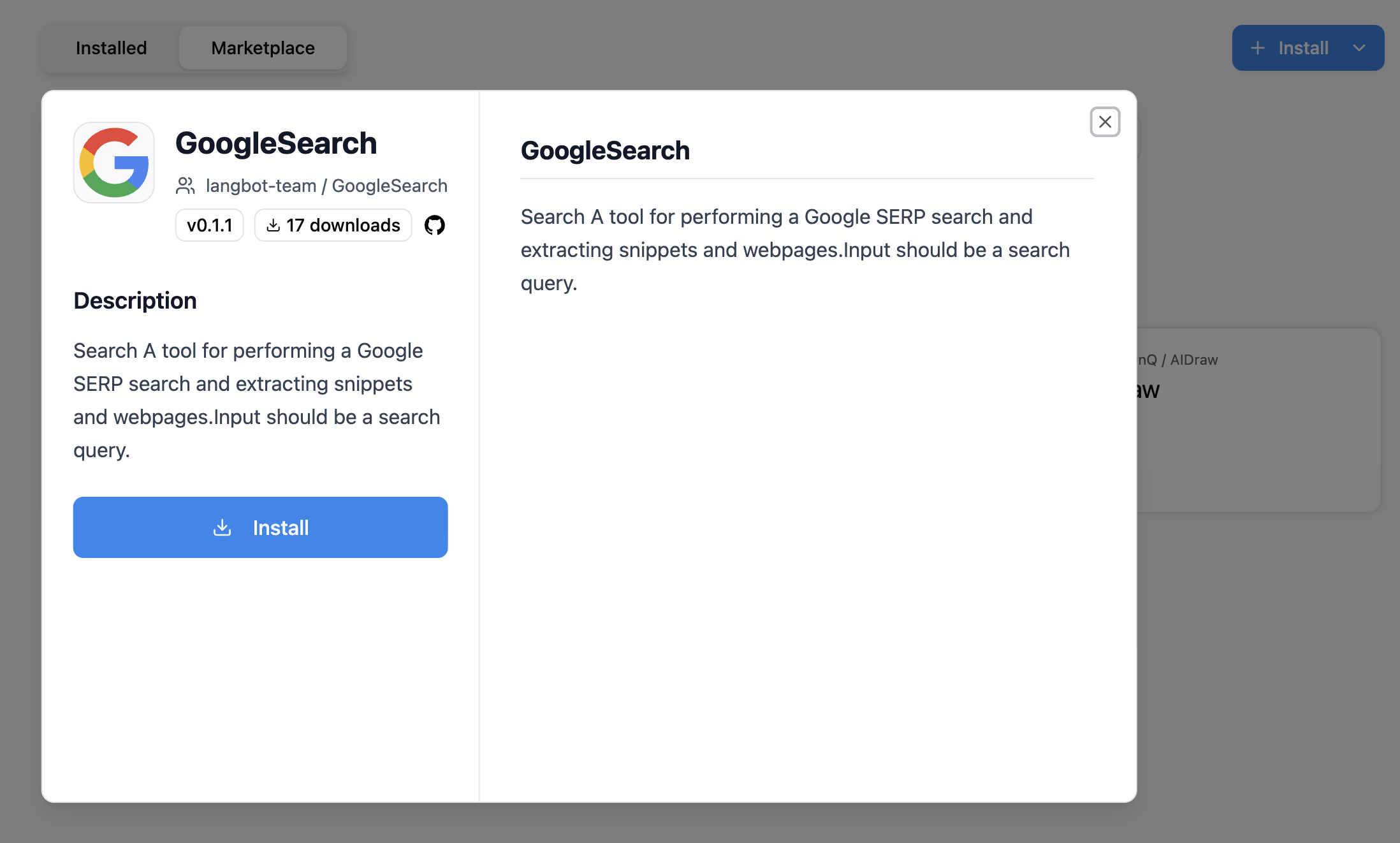 或点击插件市场 Tab,选择插件后点击安装。